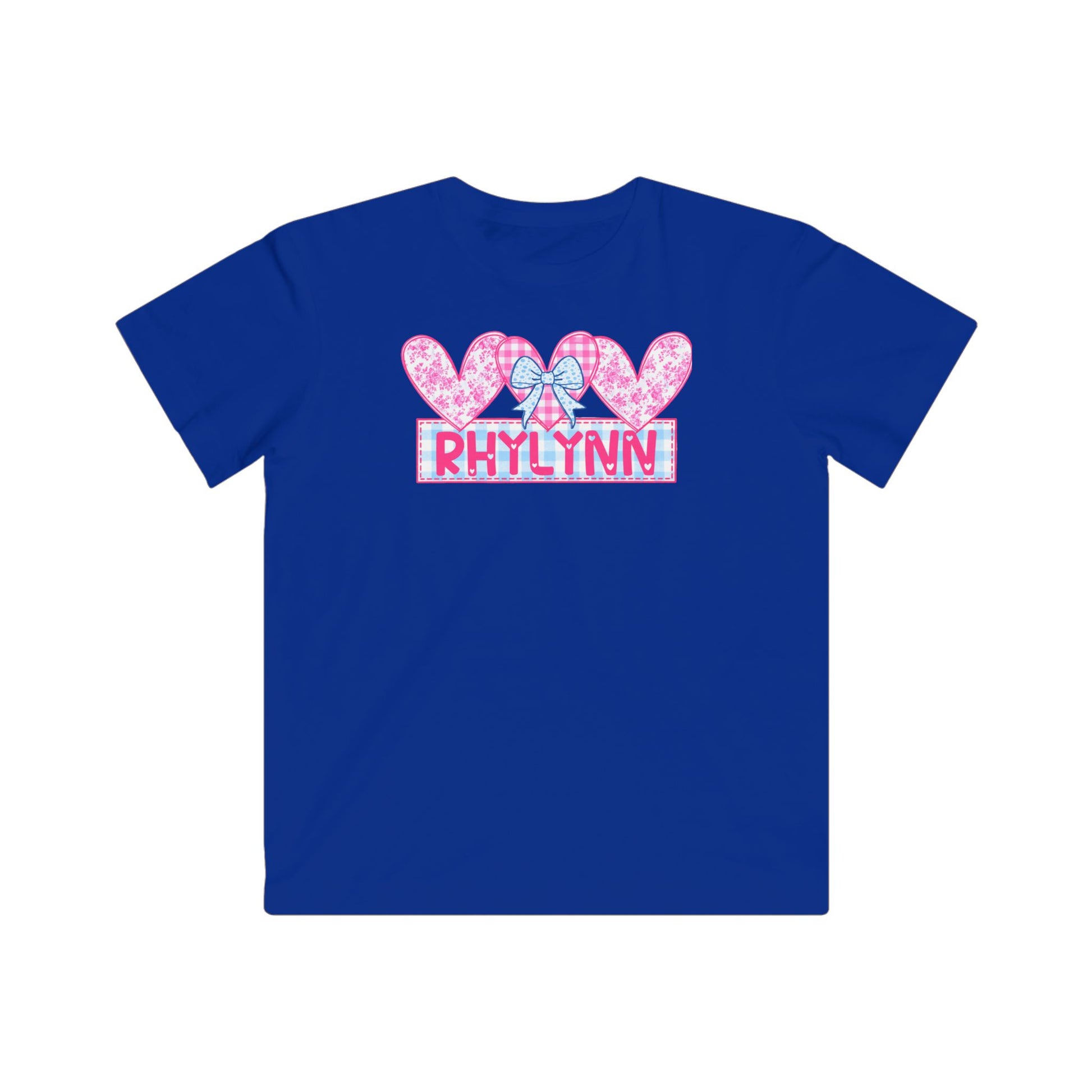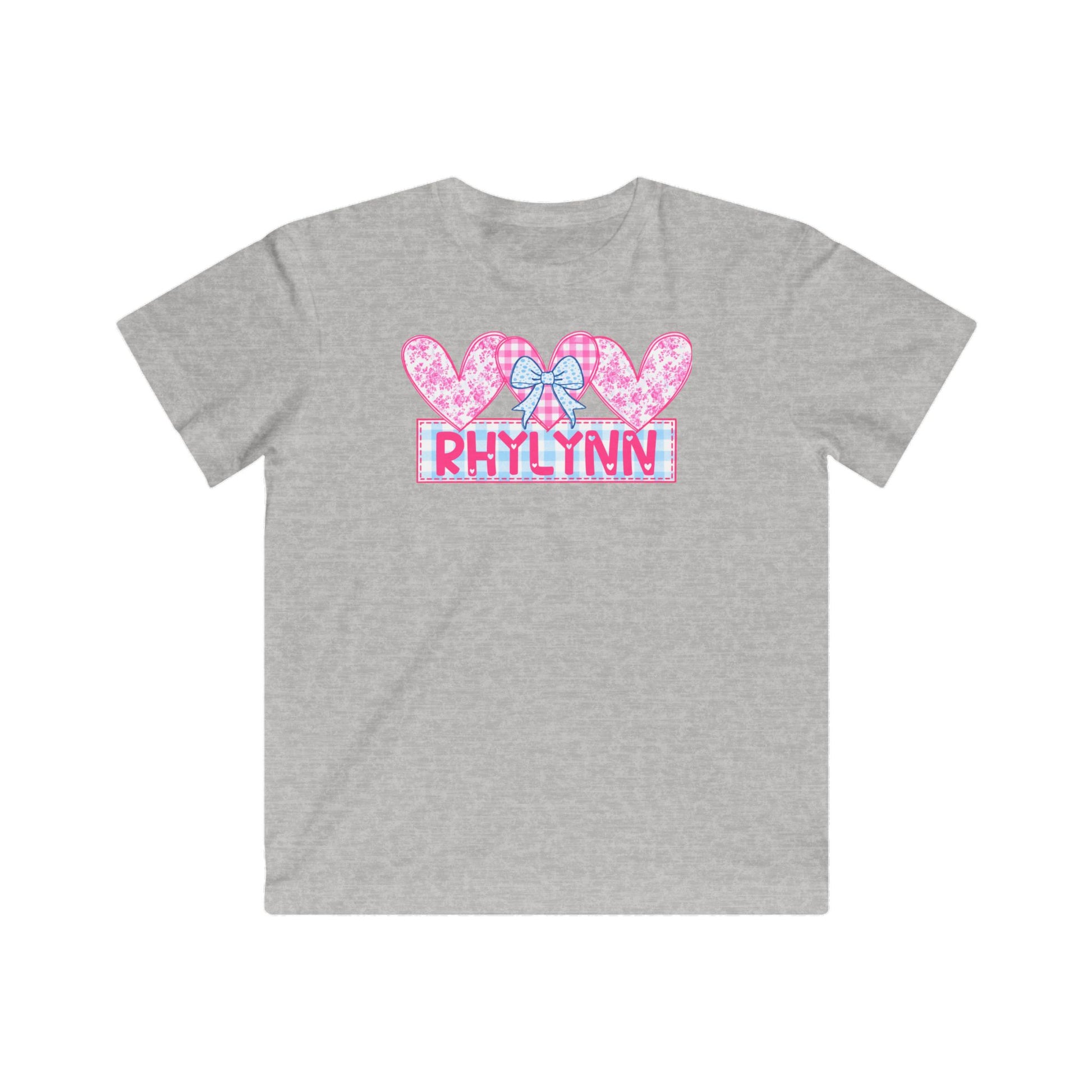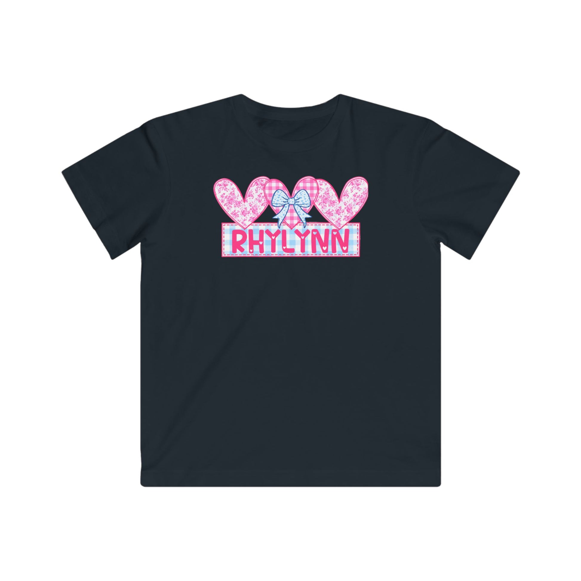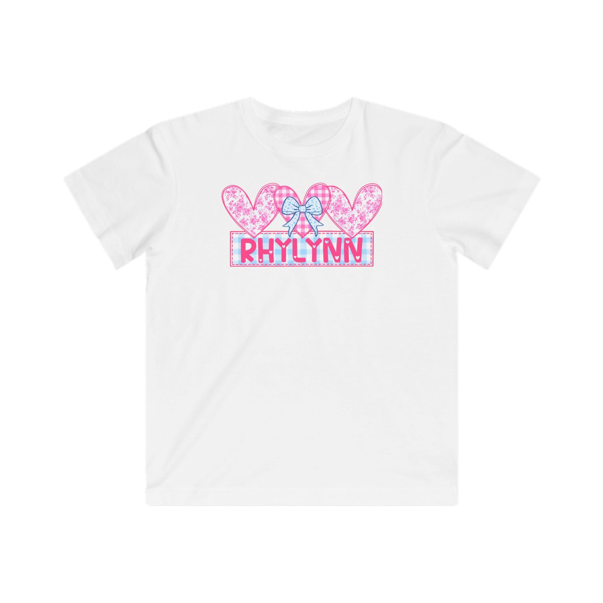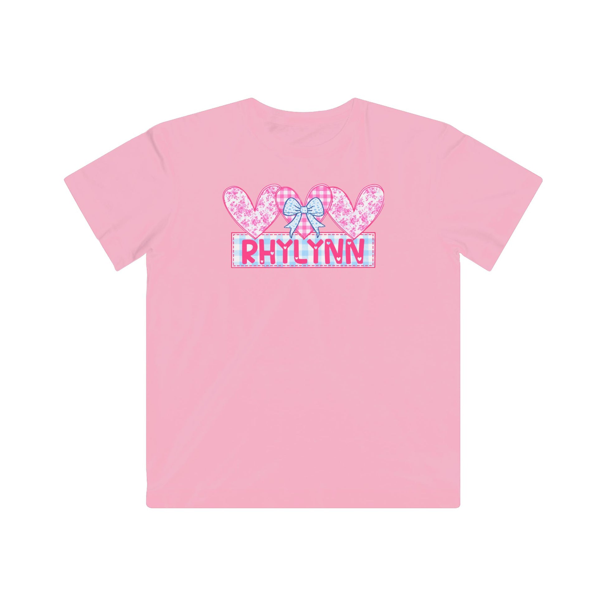Kids Tee — Personalized Pink Hearts Name "Rhylynn" with Bow