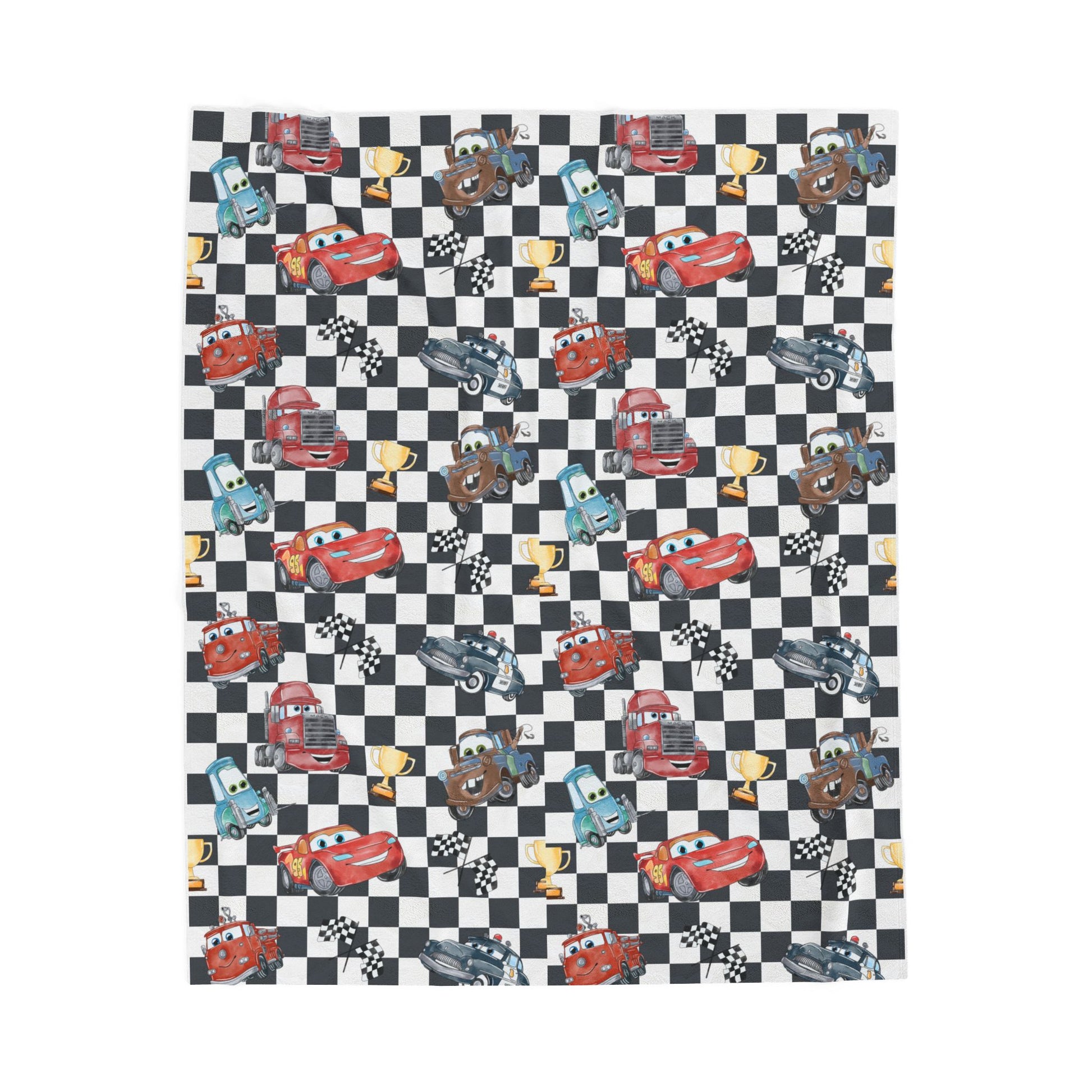 Velveteen Plush Blanket - Kids Racing Cars Checkered Throw (Lightning McQueen Style)
